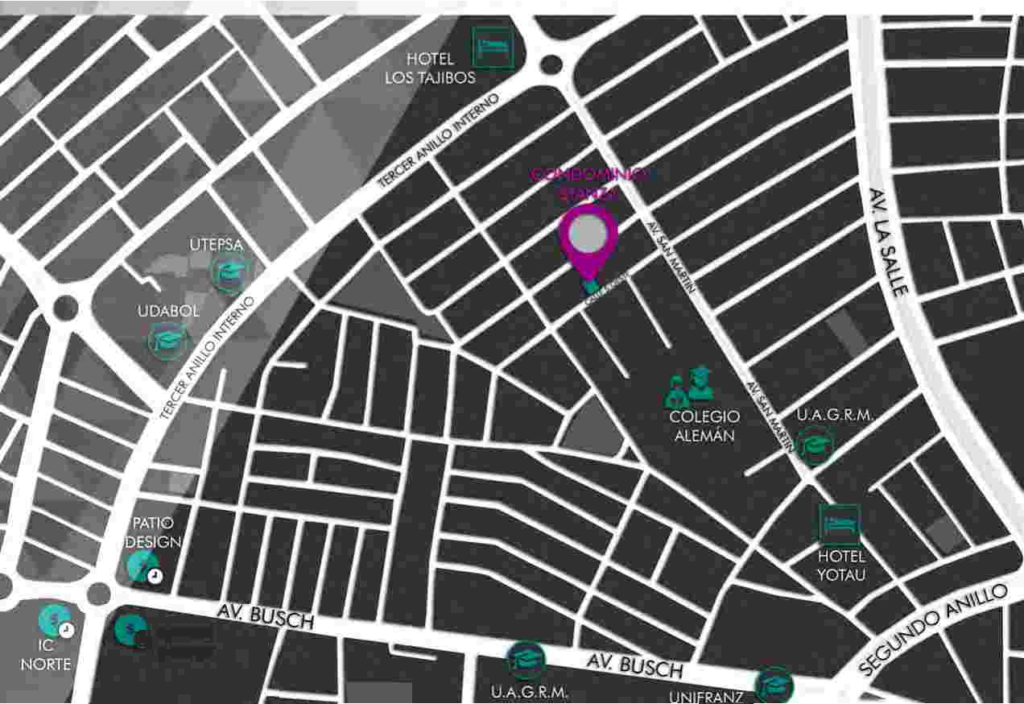 Está ubicado en Equipetrol, una de las mejores zonas de Santa Cruz. Podrás ver su majestuoso diseño entre las avenidas San Martín y Enrique Finot, sobre la Calle 5 Oeste.